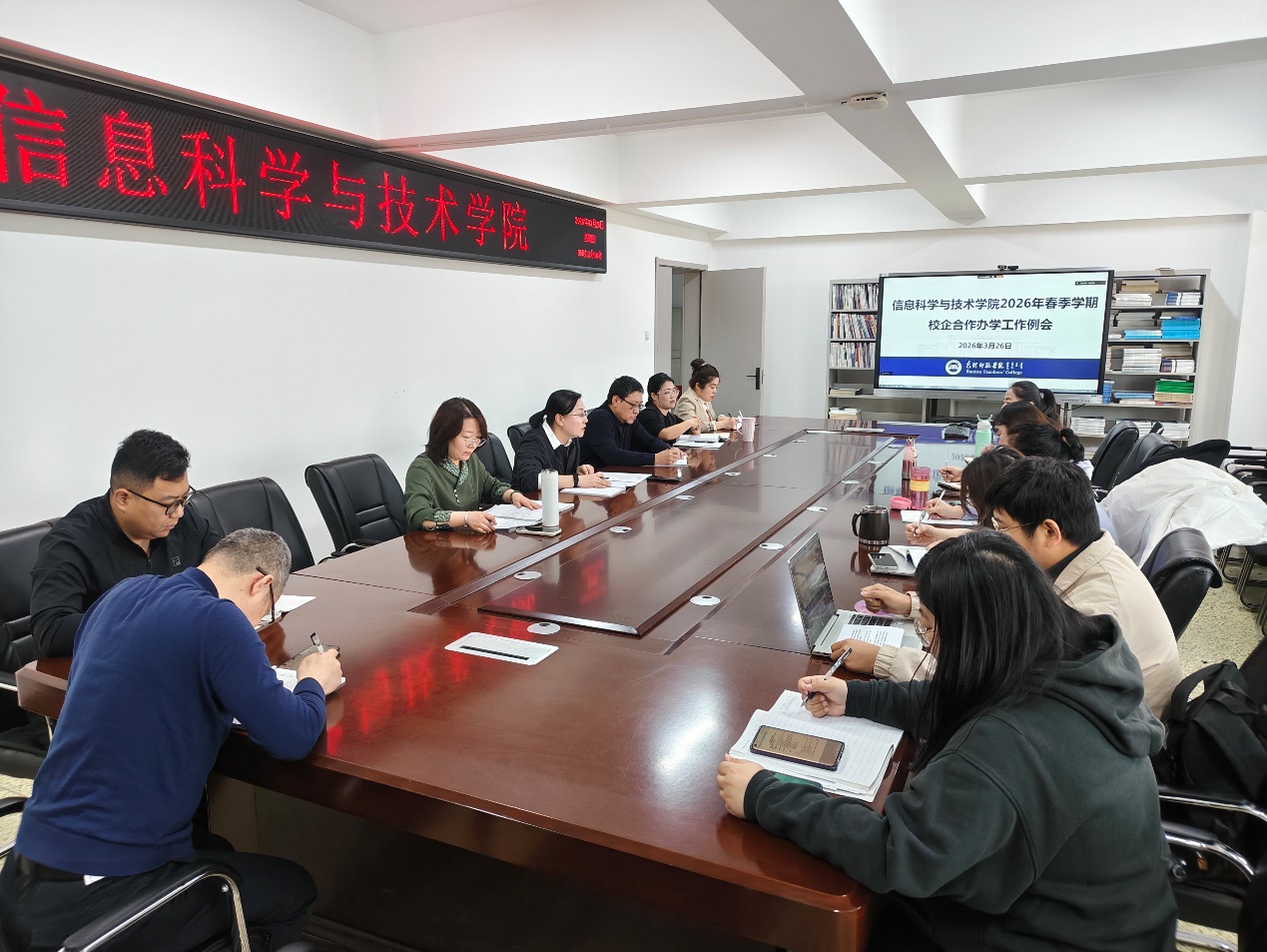 2026年3月26日上午,信息学院在博学楼710会议室召开校企合作专业新学期工作例会。会议采用线上线下相结合的形式召开。安博教育集团、中关村软件园和杰普软件三家合作企业的领导、主管教学和就业负责人和相关老师线上参会。信息学院领导班子成员、系主任、辅导员、部分教师代表和企业驻校班主任线下参会。会议由陈静院长主持。