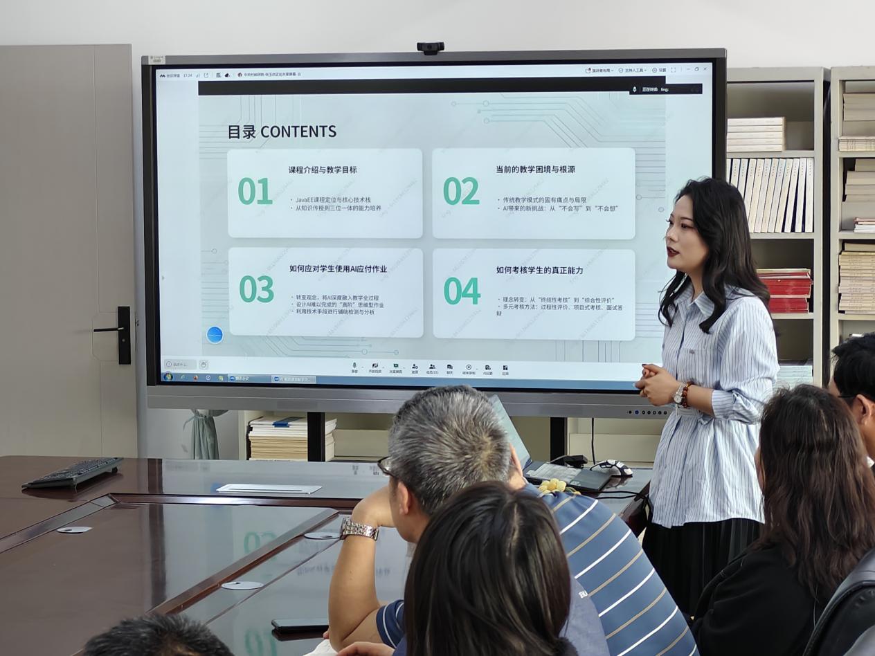 交流中,张玉然老师以JavaEE课程为例,结合当前教学实际,深入分析了AI时代背景下课堂教学面临的新问题与新挑战,系统分享了如何将人工智能技术融入日常教学、教学评价等关键环节,以及如何引导学生在课程学习中合理运用AI工具。在人工智能广泛应用的当下,专业教学中应更加注重培养学生的业务逻辑思维与底层原理理解能力,而非单纯聚焦代码实现。针对学生借助AI完成作业的新情况,张老师分享了相应的作业考评思路与实施方式;同时结合行业用人需求,介绍了将企业面试题融入课堂教学、培养学生企业级代码规范的具体做法,推动课堂教学与就业需求精准对接。